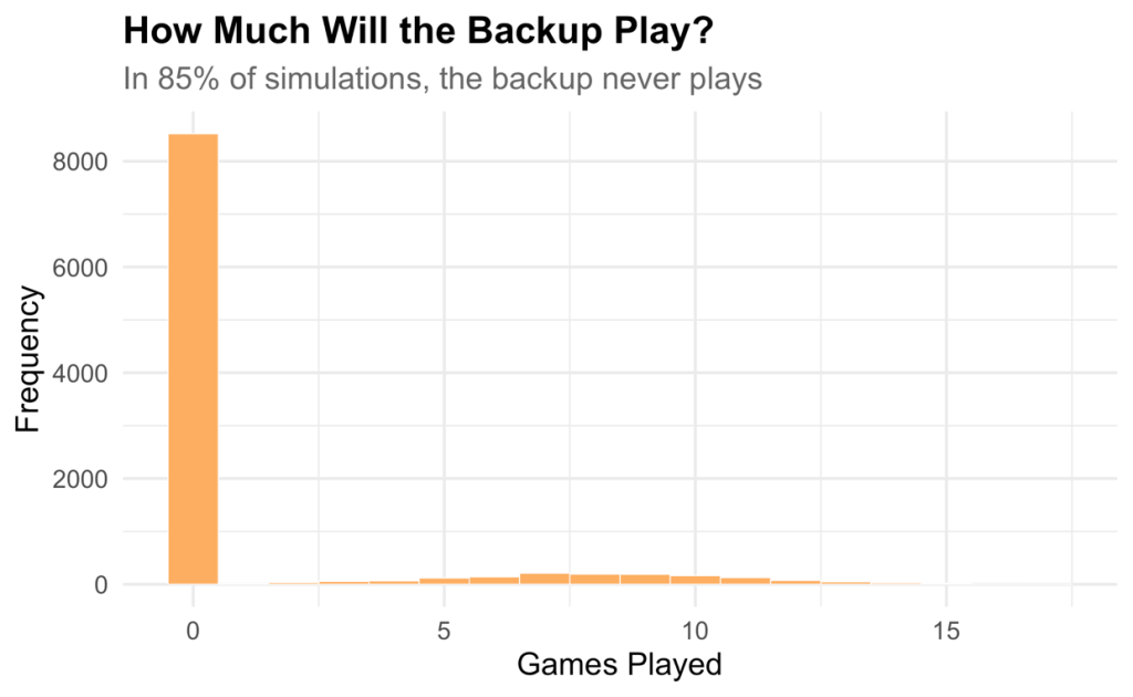 As the figure below shows, in 85% of our simulations, the backup never plays. This shows how, in a vast majority of the cases, having a competent backup goalkeeper is somewhat like insurance.
