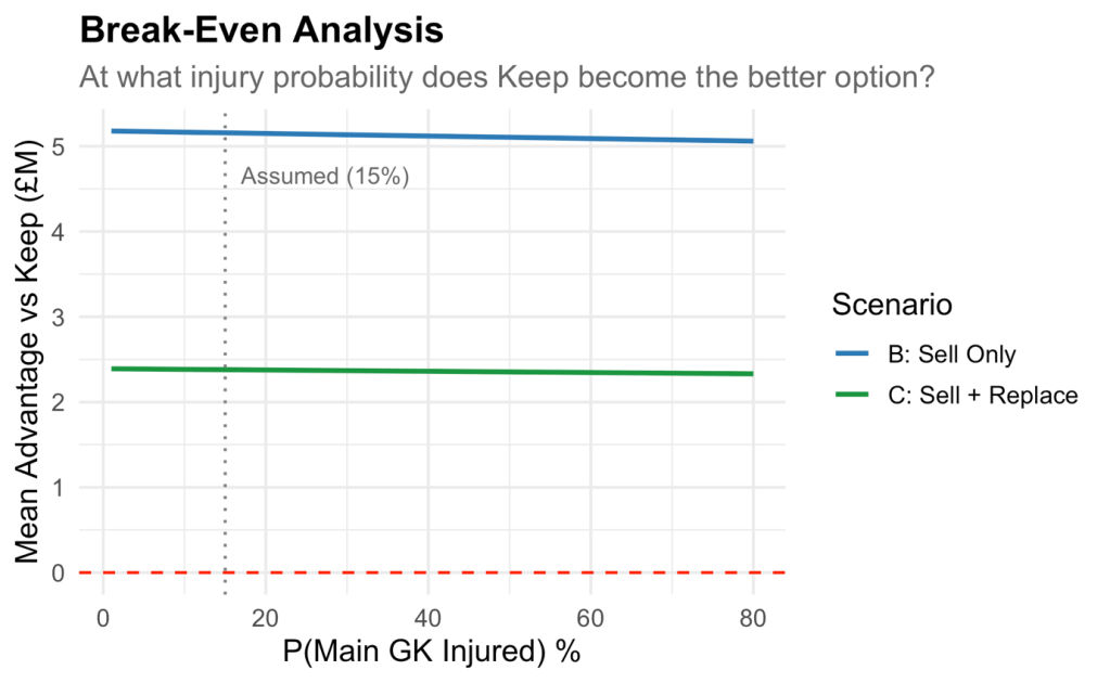 The answer is fairly simple: our simulated model shows that there is no injury scenario in which keeping Dimitrievski is worth it. Even if there were an 80% chance Agirrezabala got injured, as the line doesn’t cross 0, it still wouldn’t be worth it.