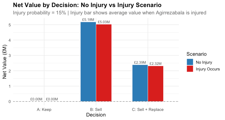 Here, even in the unlikely scenario within the probability tail that Agirrezabala gets injured and misses games, incurring a negative effect on performance, on average, both selling decisions still have substantial gains over the zero gains generated by keeping him.