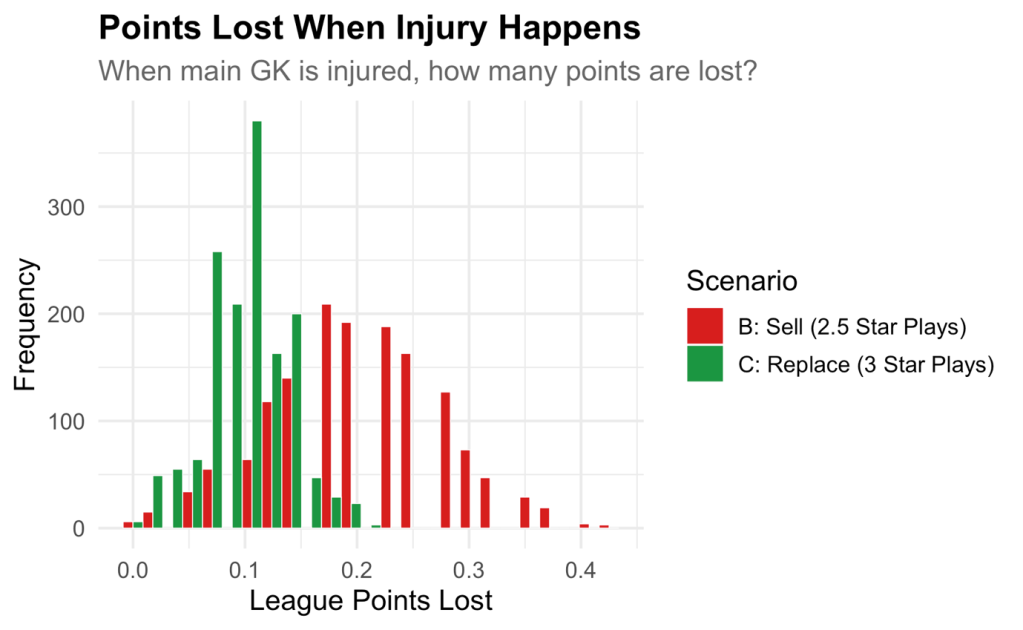Instead, we see how, even in a marginally worst-case scenario (where Agirrezabala gets injured), points lost are marginal. Option B has a wider spread, reaching as high as 0.4 points lost over the season, whereas Option C has a much tighter spread, and lower, barely exceeding 0.2 points lost.
